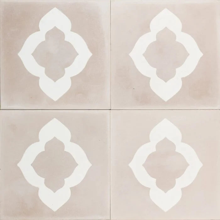 Arabian Desert Tile. Mushroom grey tile with a thick white stylised frame shape that centres it. Arabian Desert to compliment any interior and exterior.