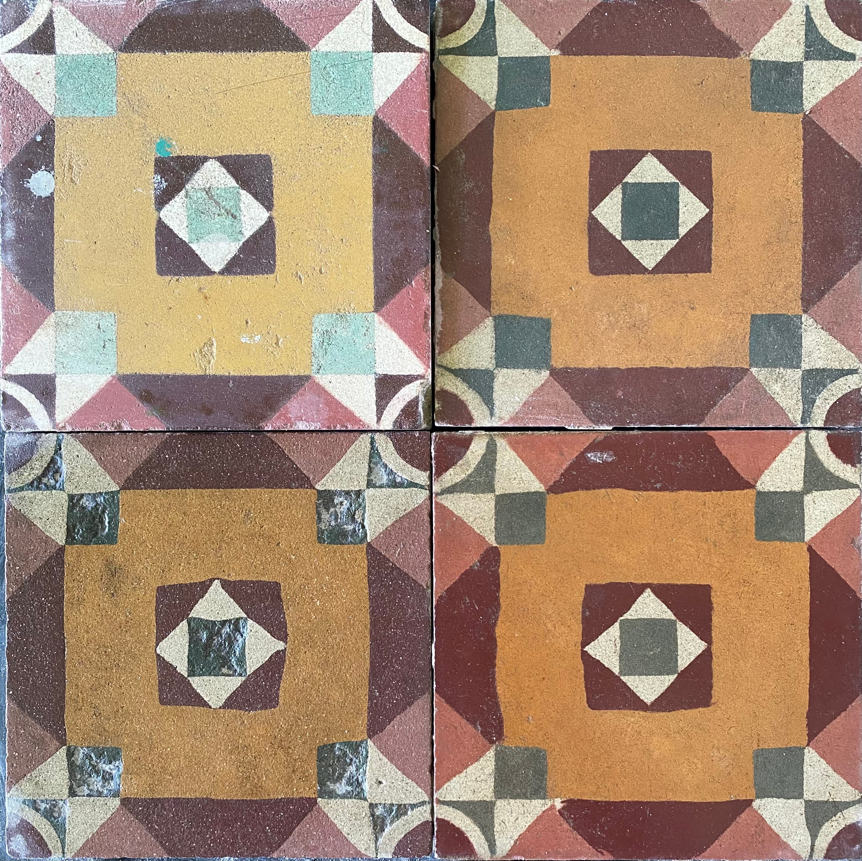 Antique encaustic tiles, hand made and salvaged from all over Europe and beyond. These tiles are hundreds of years old and will last for hundreds more, due to the technique in which they are made. Encaustic cement tiles are hand poured, resulting in the pigments being embedded 2-3 mm deep within the surface of the tile. This technique sets them apart from other printed tiles, making them a truly unique, lifetime investment.