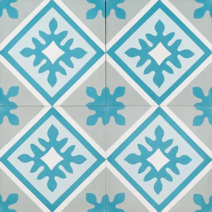 Athens Tile. **Made to order** Grey and turquoise with white flourishes and diamond shapes bring life to this vibrant tile. Athens Tile for any interior.