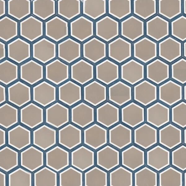 Avignon Tile. A hexagon shaped tile with a mushroom brown centre rimmed with white and smokey blue, making a contrasting pattern. Avignon to bring intrigue and life to any interior.