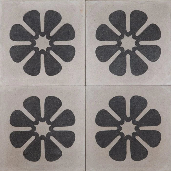 Black and Grey Flora Tile. An earthy grey tile with a strong black flower that centres the tile. Replicated from a popular antique design, the Black and Grey Flora is destined to make a statement to any interior.
