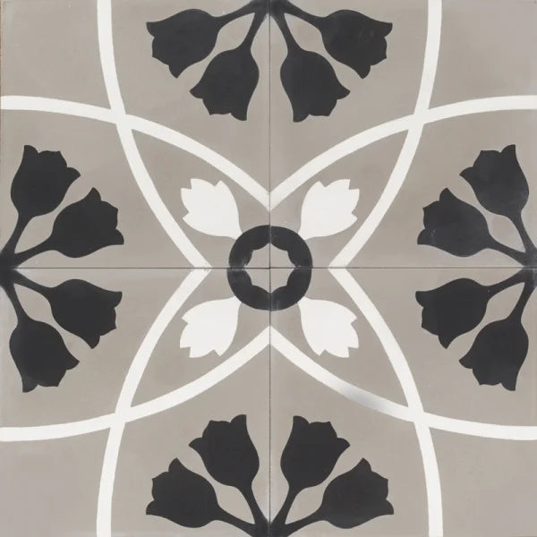 Black and Grey Tulip Tile. A mid grey tile with sweeping white lines that frame black flower shapes. Black and Grey Tulip for any interior.