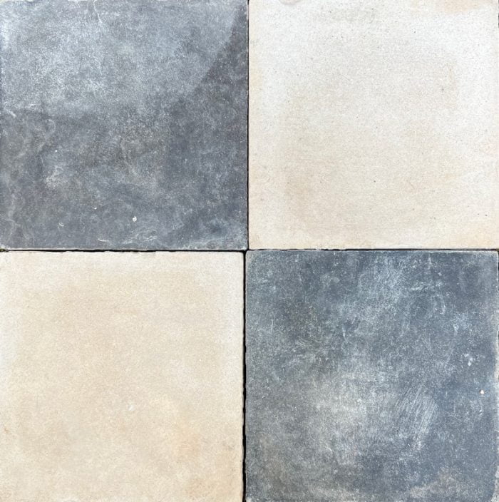 A combination of 2 different coloured antique tiles to create a checkerboard effect.