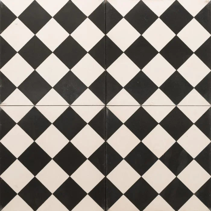 Black and White Diamond Tile. A striking tile made up of black and white checks standing as diamonds. A tile to make a statement in any interior, Black and White Diamond.