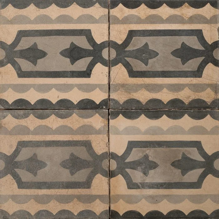 Black Bodhi Border Antique Tile. Soft brown with striking black and muted grey detailing makes up chains and shapes. Black Bodhi Border Antique Tile to bring life to any interior.