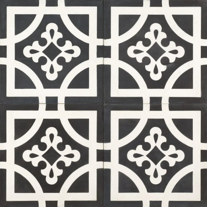 Black Indian Earth Tile. Midnight and white colour this bold tile. Framed intricate flourishes centre the tile. Black Indian Earth for any interior.