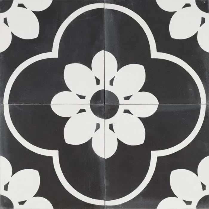 Black Marseille Tile. Black tiles balanced out with a strong white flower pattern and decorative lines. Black Marseille to strengthen any interior.
