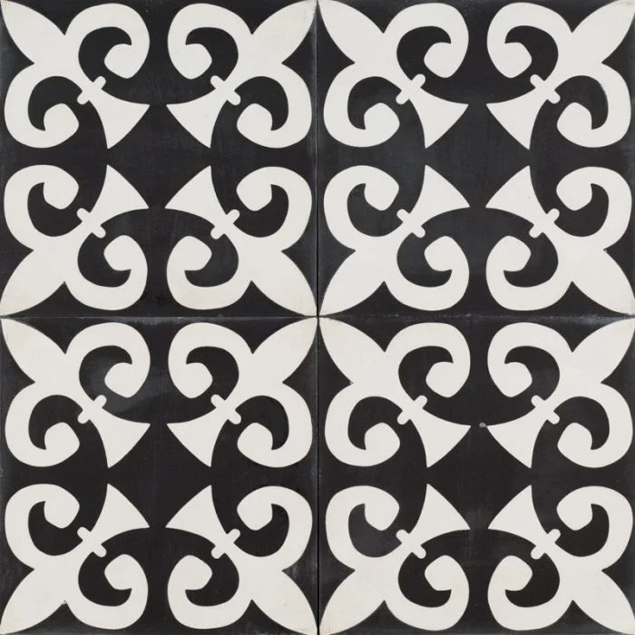 Black Medieval Manor Tile. A vibrant tile with striking black and white curling shapes that centre the tile. Black Medieval Manor for any interior.