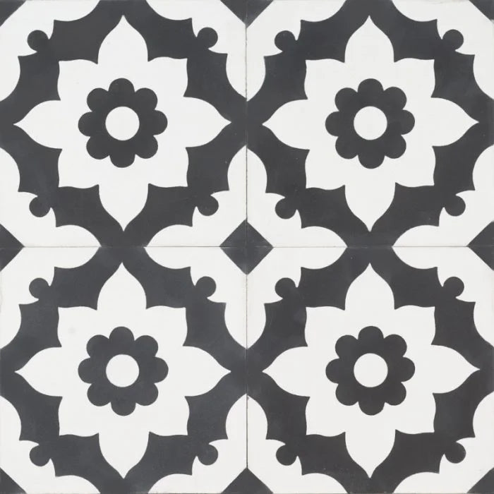 Black Sol Tile. Black and white coloured tile with big white flowers that cascade out, contrasted by black. Black Sol for any interior.