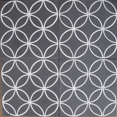 Black Tango Tile. The black contrasts with the thin, white petal shapes that cover the tile. This beautiful monotone palette will complement any interior or exterior.