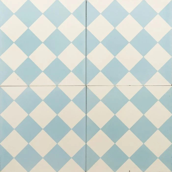 Blue and White Diamond Tile. Gentle colours of light blue and white compliment each other in a checkered diamond pattern. Blue and White Diamond Tile to bring energy to any interior.
