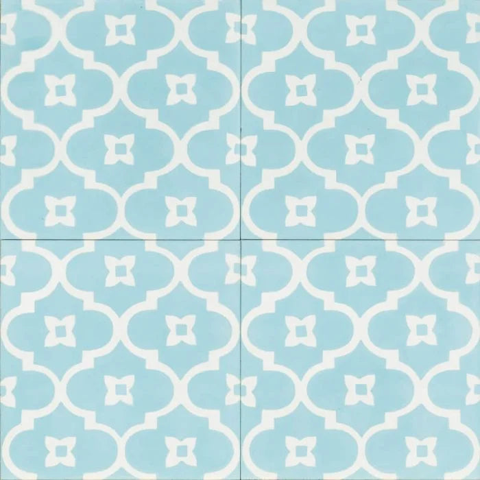Blue and White Moorish Night Tile. A soft blue tile with a white chain pattern splattered with small flowers. Blue and White Moorish Night for any interior.