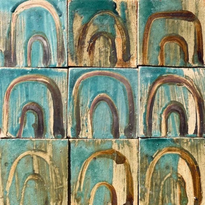 Blue Chasing Rainbows tile. How amazingly creative and quirky is this tile! Hand made and painted the two lined chocolate rainbows are complimented by ambient colours of blue revealing some of the warm natural terracotta in parts giving this design a stunning contrast. Blue Chasing Rainbows tile will bring their eclectic essence and arty flair making them a must have feature in any interior or exterior installation.