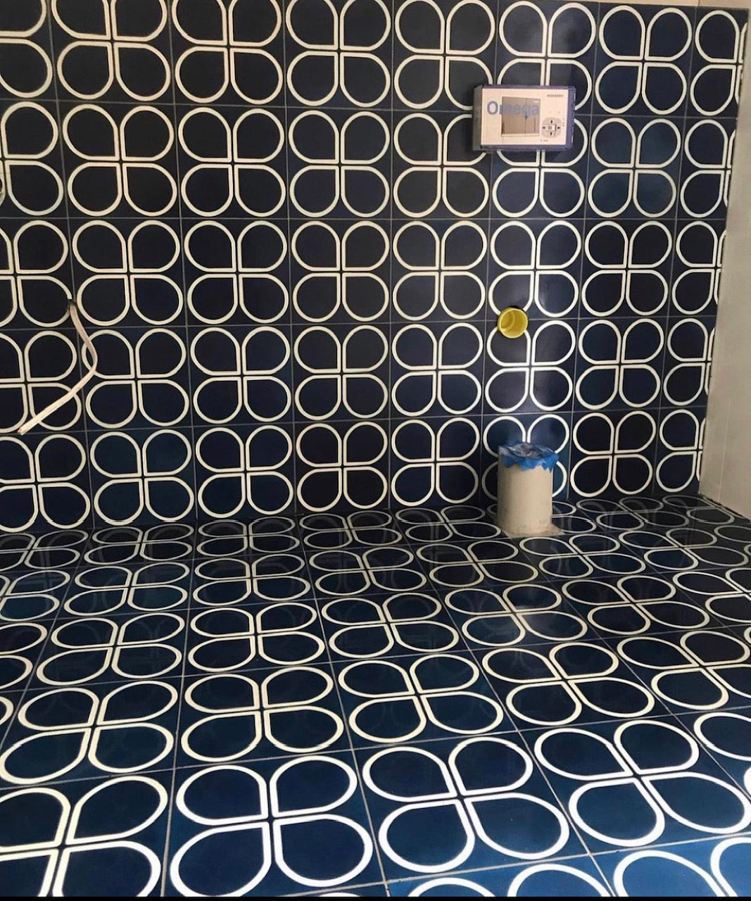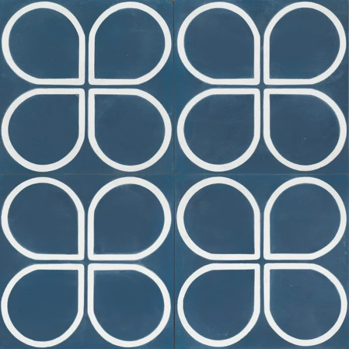 Blue Coco Tile. A deep smokey navy coloured tile with beautiful white petal shapes that turn into flowers. Blue Coco to compliment any interior