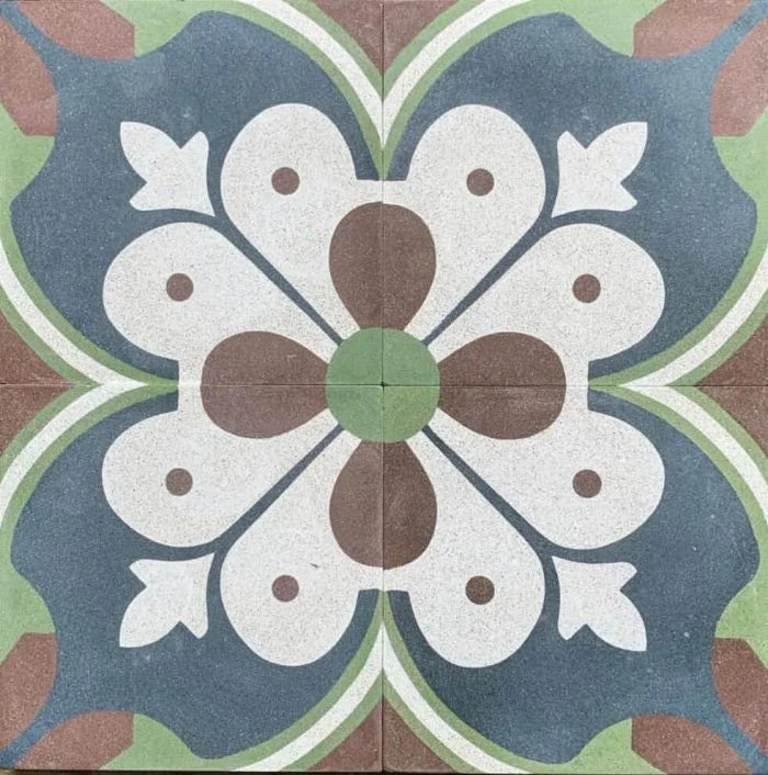 Blue Magnolia Tile. Earthy tones with splashes of green favour the abstract magnolia that centres the tile. Blue Magnolia for any interior.