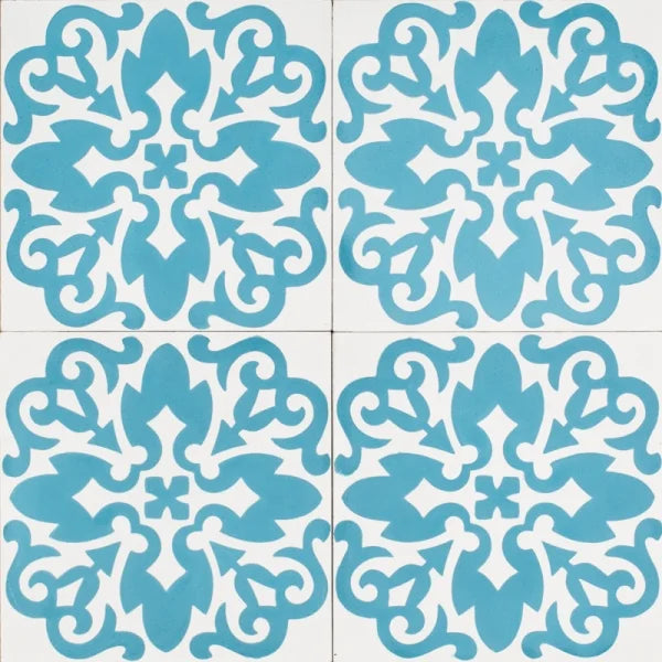 Blue Manor Tile. White tile a blue design that centres the tile and cascades out, making a floral pattern. Blue Manor for any interior.