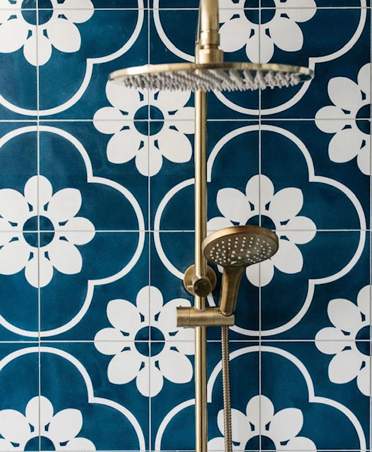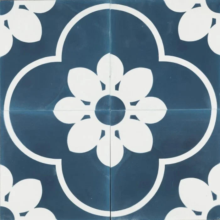 Blue Marseille Tile. A smokey blue colours this tile, the perfect combination for the white flower design that centres it. Blue Marseille for any interior.