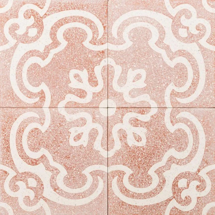 Blushing Magnolia Tile. A grainy blush coloured tile with a white flower design that cascades out in mandala pattern. Blushing Magnolia for any interior.