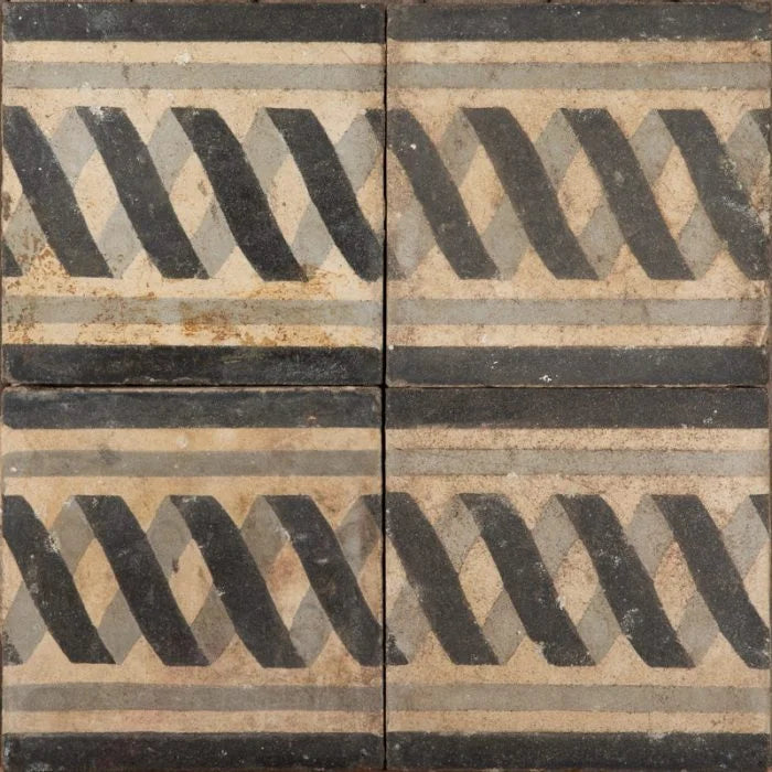 Bodhi Border Antique Tile. A vibrant zig zag pattern that can be partnered with the Bodhi Antique Tile or let this tile shine on its own with its own story to tell. Black, charcoal and grey is reflected strikingly in this age old tile. Bodhi Border Antique Tile to bring life to any interior.
