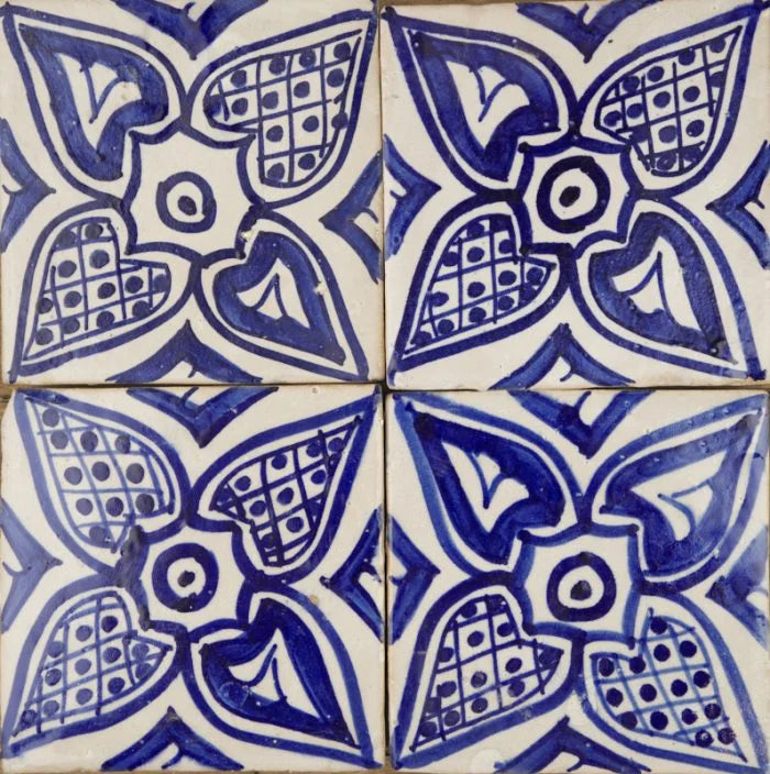 Casablanca Lily Tile. White tile with a royal blue flower and embellishments. Beautiful in every light, the Casablanca Lily Tile for any indoor/outdoor feature walls
