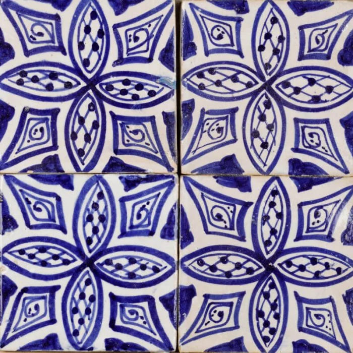Casablanca Sunflower Tile. White and royal blue tile with large petal-like shapes that cascade out. Casablanca Sunflower for any interior.