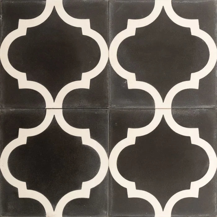 Charcoal Arabesque Tile. Deep charcoal coloured tile with a vibrant white pattern that makes up a big stylised chain. Charcoal Arabesque Tile to make a statement in any interior.