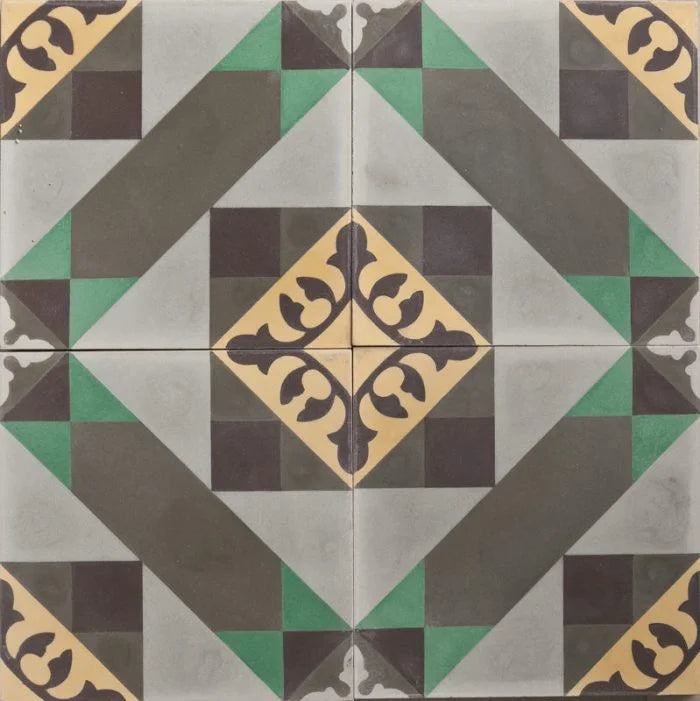 Cuban Tile. Colours of muted yellow, charcoal and grey with deep jade details bring life to this tile. Cuban Tile to bring energy to any interior.
