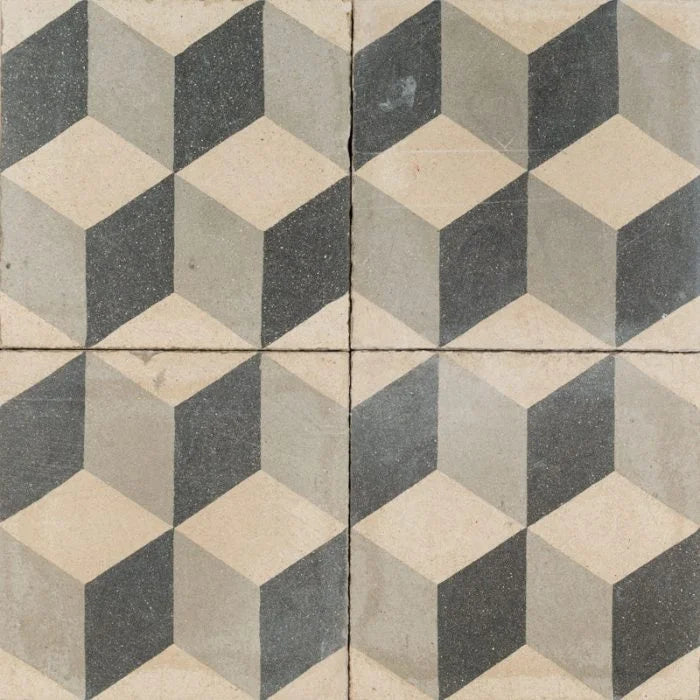 Cubista Antique Tile. Off white, charcoal and grey make a cube formation that repeats across the tile. Cubista Antique Tile, to bring drama and life to any interior.