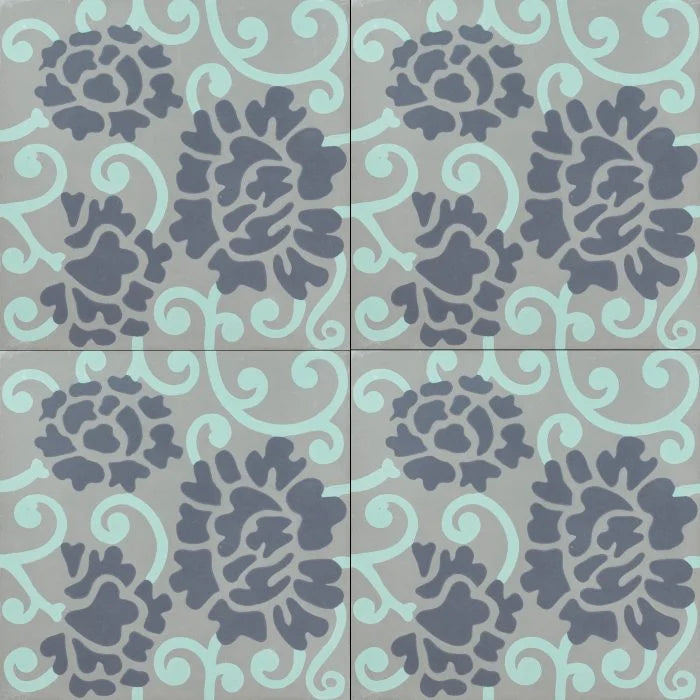 Dans le Jardin Tile (navy). An absolutely stunning combination of navy blue flowers and aqua green foliage. If it is a garden affect, or a true love of flowers you want to incorporate into your space you have found the perfect fit.