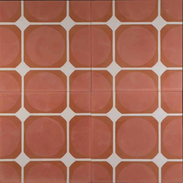 Dark Musk casa de Janelas Tile. A beautiful tile inspired from a popular antique tile that was once in stock. It is adorned with a deep musk pink and pops of white and burnt orange bringing this retro design to a modern platform. To inspire any interior, the Casa de Janelas is a must.