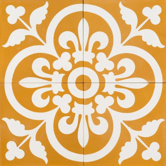 Dark Mustard Royal Tile. A gold coloured tile with a vibrant white pattern that makes a strong flower in the centre. Dark Mustard Royal for any interior.