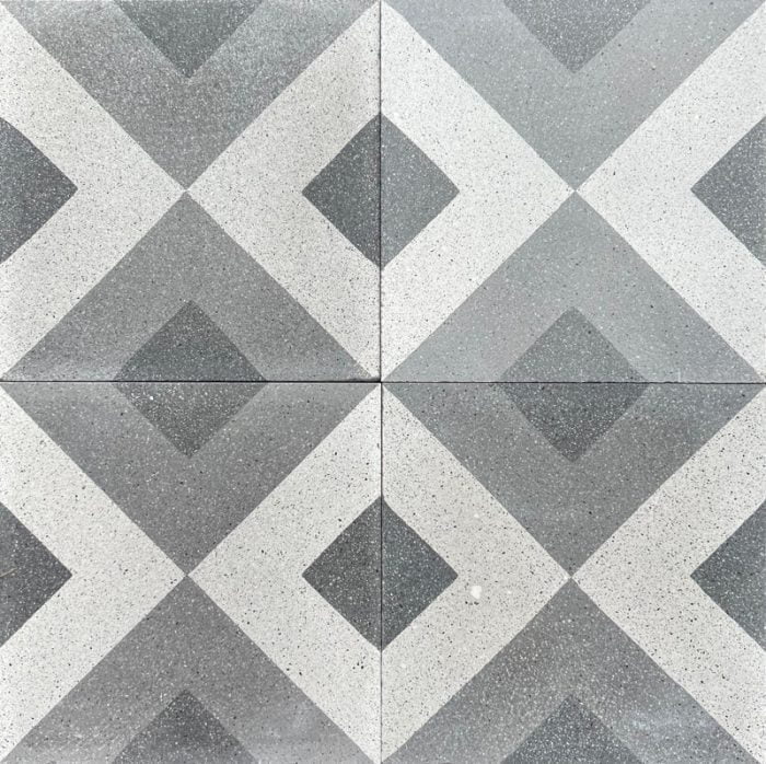 Diamond Terrazzo Tile. Energetic with a sense of power, diamonds meet terrazzo in a combination of grey, charcoal and off white tones. With moody charm in mind add the Diamond Terrazzo tile to any space for an energetic and uplifting vibe for any interior or exterior installation.