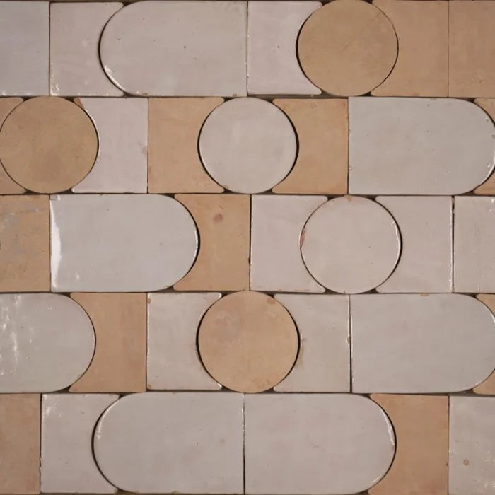 Discoteca tile. A fun loving tile made up of tessellating shapes. Some glazed white, some raw clay, circle and rectangle edges fit into each other to make up a retro inspired pattern. A favourite here at Jatana Interiors