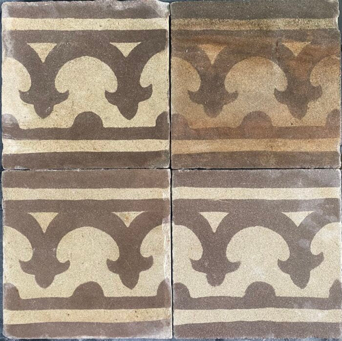 The Eleanor Border offers an essence of courtly love and medieval poetry to our antique border range. A warm brown pattern on an aged beige background, these salvaged encaustic tiles are a truly historical addition to any indoor or outdoor project.