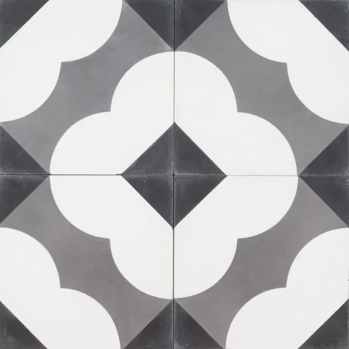 English Rose Tile. Contrasting colours of mid grey, white and black to compliment the strong shapes of this tile. English Rose to bring life to any interior.