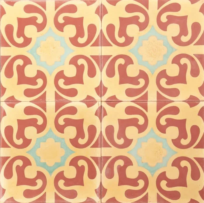 Exotic Floral Tile. A deep terracotta red coloured tile with a detailed muted gold pattern with blue flourishes. Exotic Floral for any interior.