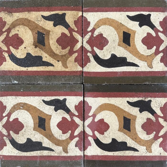 Exotic Red Daisy Border Antique Tile. This beautiful antique tile boasts colours of red, mustard and black to create a bold and unique look to your space. The perfect border to pair with its sister tile ‘Exotic Red Daisy Antique’ to complete the look. Otherwise this tile can be mixed with any tile of your choice! The Exotic Red Daisy Antique will bring life to any interior and exterior space.
