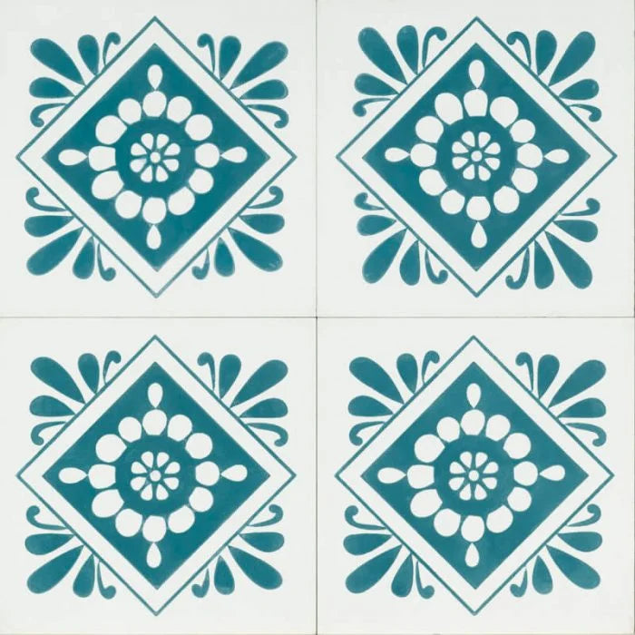 Florence Tile. A crisp white tile with a smokey teal pattern that centres it and frames the tile. Florence Tile to compliment any interior.