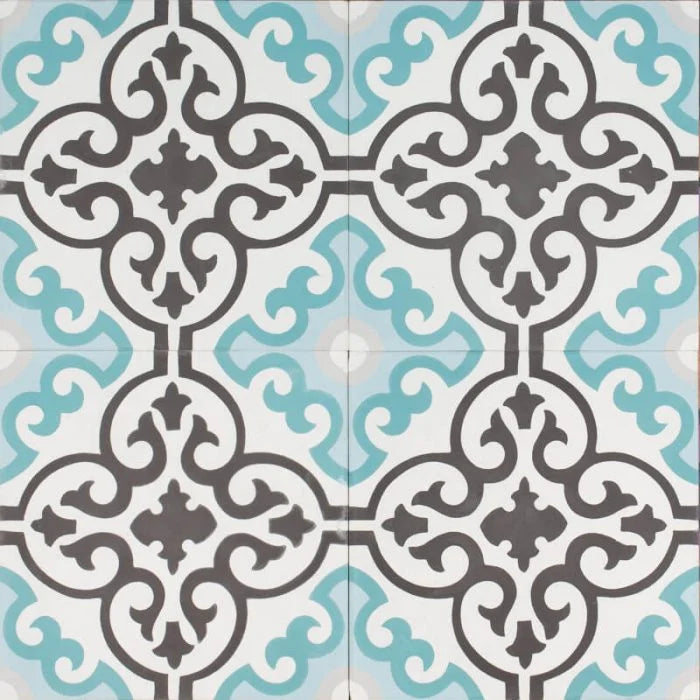 Florentine Tile. A bright and vibrant tile with a blue, white and black cascading pattern that flourishes from the centre. Florentine Tile, for any interior