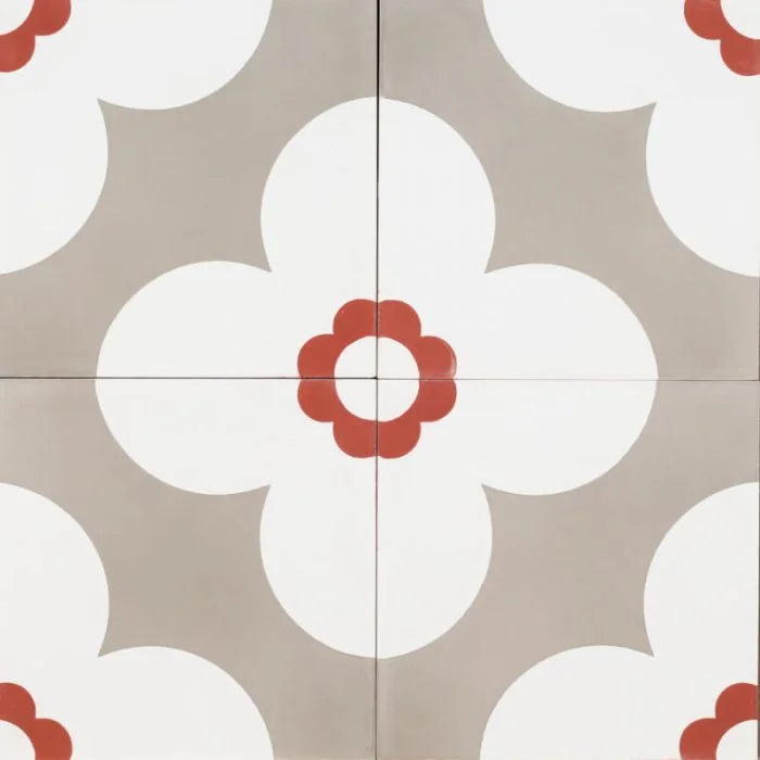 Flores Tile. Mid grey coloured tile with big white flowers and red flourishes that centre them. Flores Tile, simple and bold.