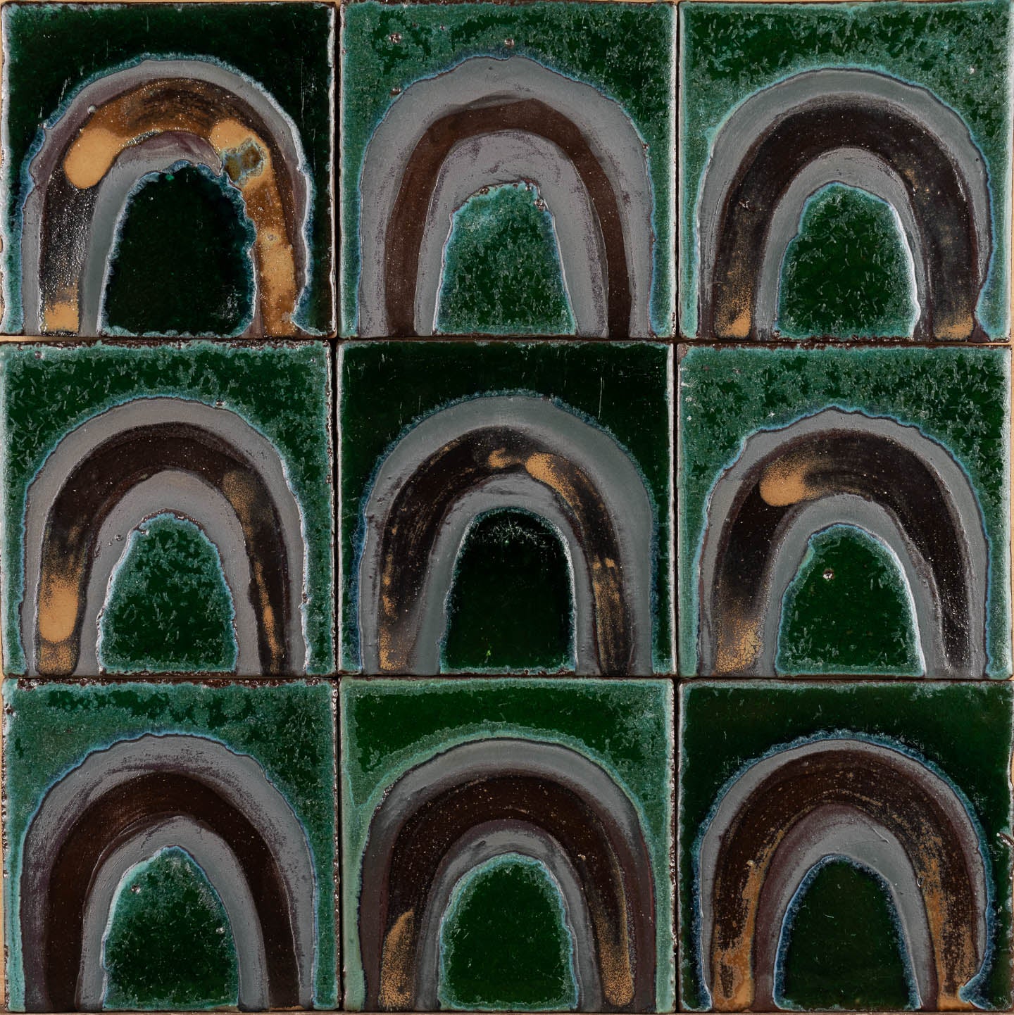 Forest Rainbows. This tile is hand painted with 2 little rainbow arches in a metallic glaze. Lots of variation within the background with striking earthy green and burnt amber tones, making this tile a lovely feature tile. Forest Rainbows, for variety, flair and a bold statement in any interior/exterior setting.