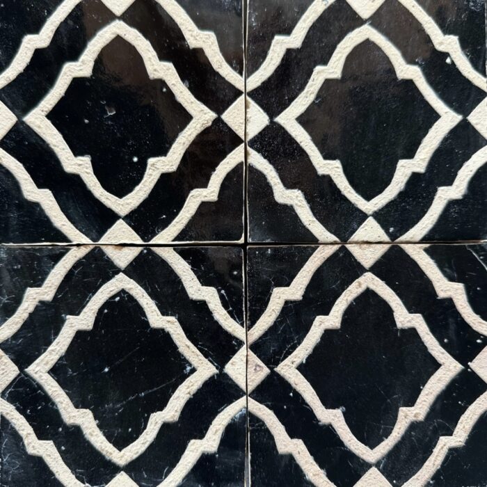 Glazed Black Jewels Tile. An elegant black glazed tile with a hand chiseled design to create a unique and timeless look. Each of these tiles are handmade by Moroccan Artisans. Glazed Black Jewels are perfect as a timeless feature for any interior/exterior space.