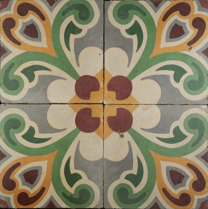 Green Lotus Antique Tile. Let the wow factor of this beautiful antique tile take you on an ancient journey of beauty, wonder and awe. The elegant pattern is complimented with stunning colours, timeless. In excellent condition this tile of over 100 years old will fill any room with character, stories of the old, and style. The Green Lotus Antique tile is perfect for any interior and outdoor installations.