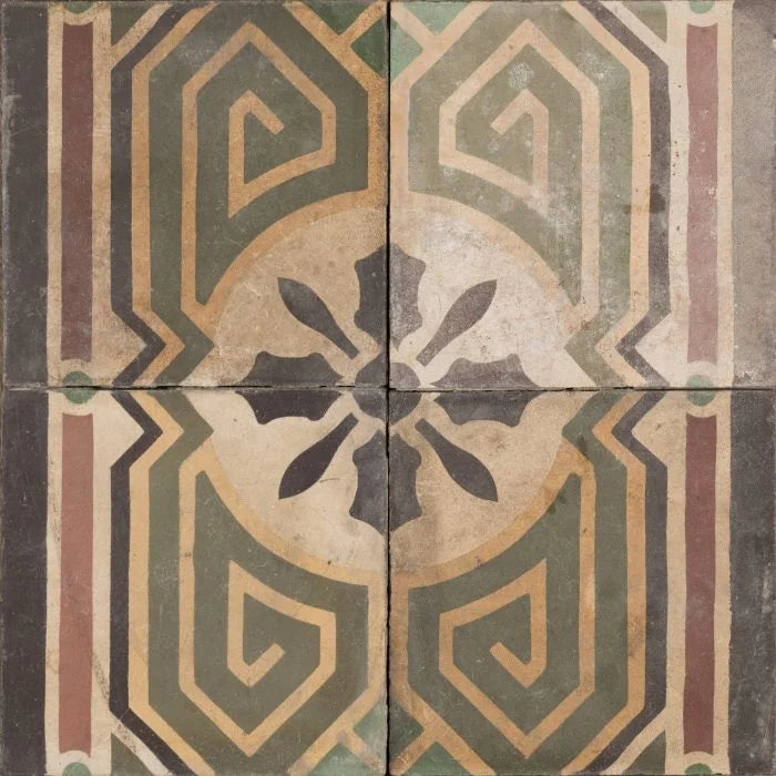 Green Manor Antique Tile. A detailed pattern lines this tile, complimented by colours of deep green, maroon, off-white and charcoal with pops of gold. Green Manor Antique Tile to bring life to any interior.