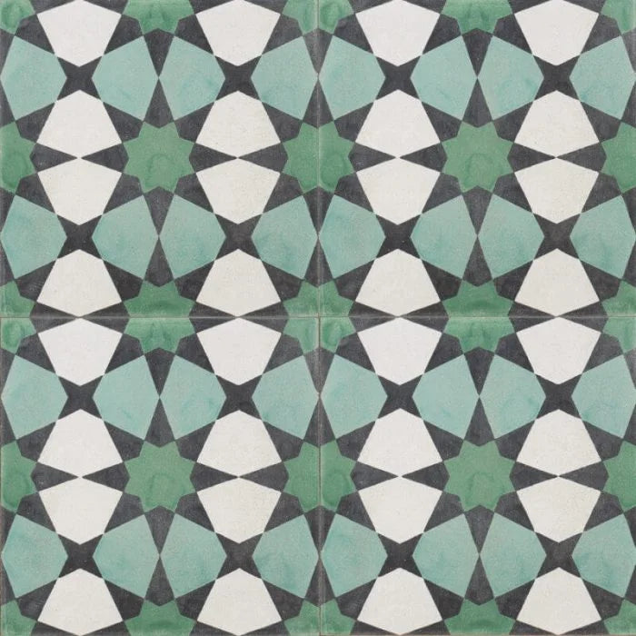 Green Moroccan Mosaic Tile. Complimenting colours of greens with white and black make up a detailed mosaic pattern. Green Moroccan Mosaic for any interior.