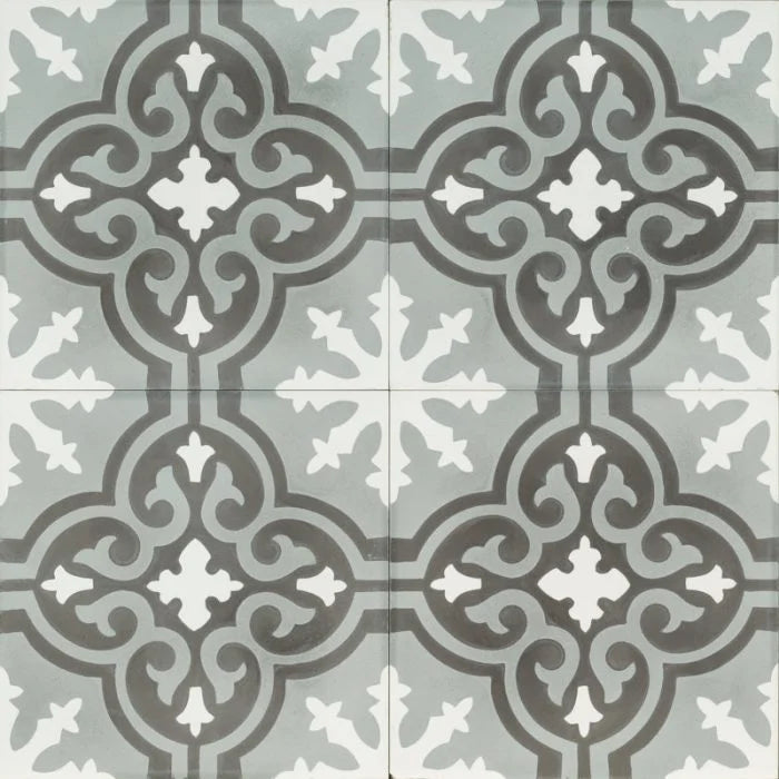 Grey and Black Flower Tile. A bold moroccan design that combines a cultural twist with contemporary flair. Bring any space alive with this vibrant pattern.