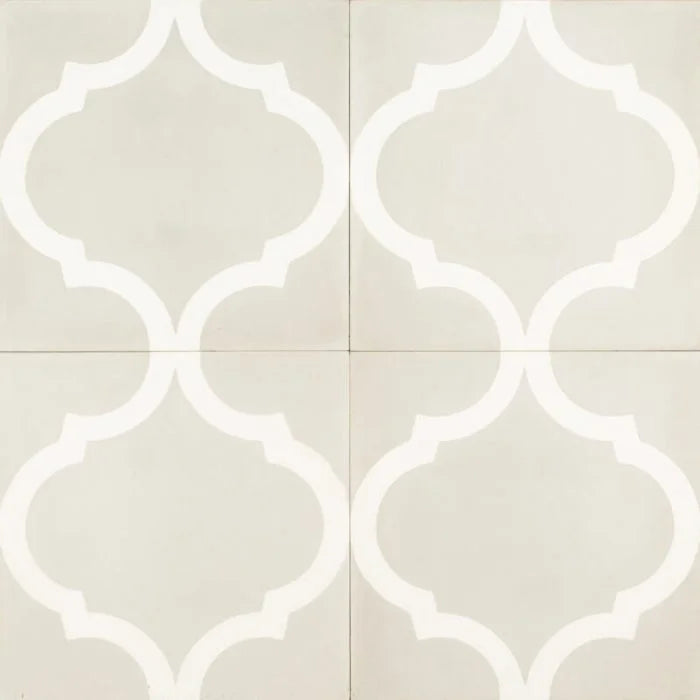 Grey Arabesque Tile. Mushroom grey with a simple, white stylised frame design. Simple, classic, Grey Arabesque to bring life to any interior.