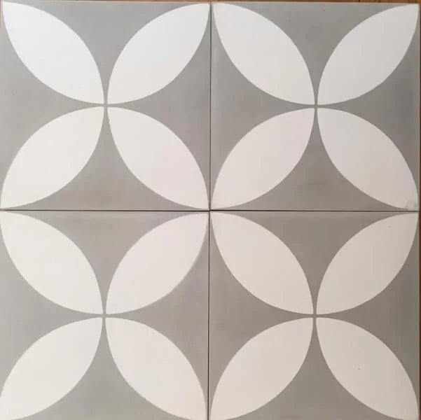 Grey Fleur Tile. A mid grey coloured tile with big white petal-like shapes that make a statement. Grey Fleur to bring life to any interior.