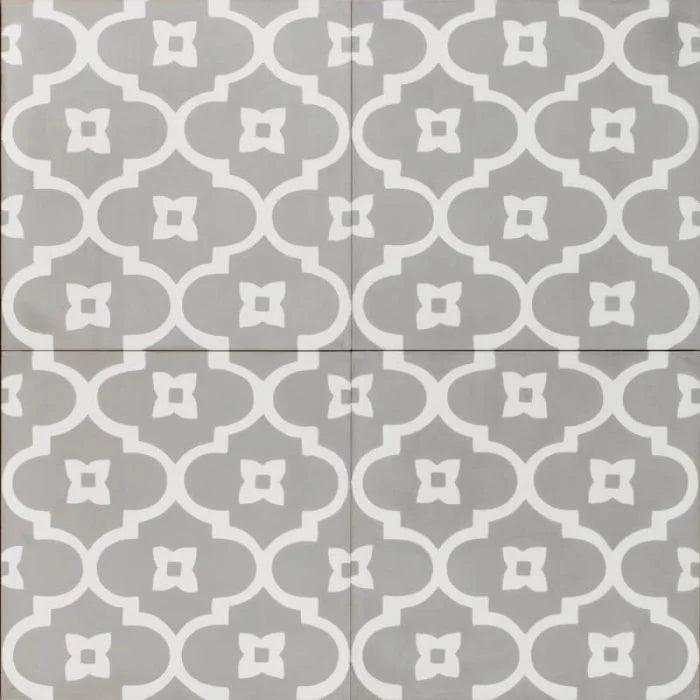 Grey Moorish Night Tile. A mid grey coloured tile with a white chain-like pattern with small flowers in between. Grey Moorish Night, for any interior.