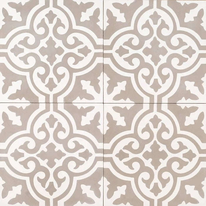 Grey Moroccan Bazaar Tile. A mid grey coloured tile with an intricate white pattern full of curls and flourishes. Grey Moroccan Bazaar Tile to bring energy to any interior.